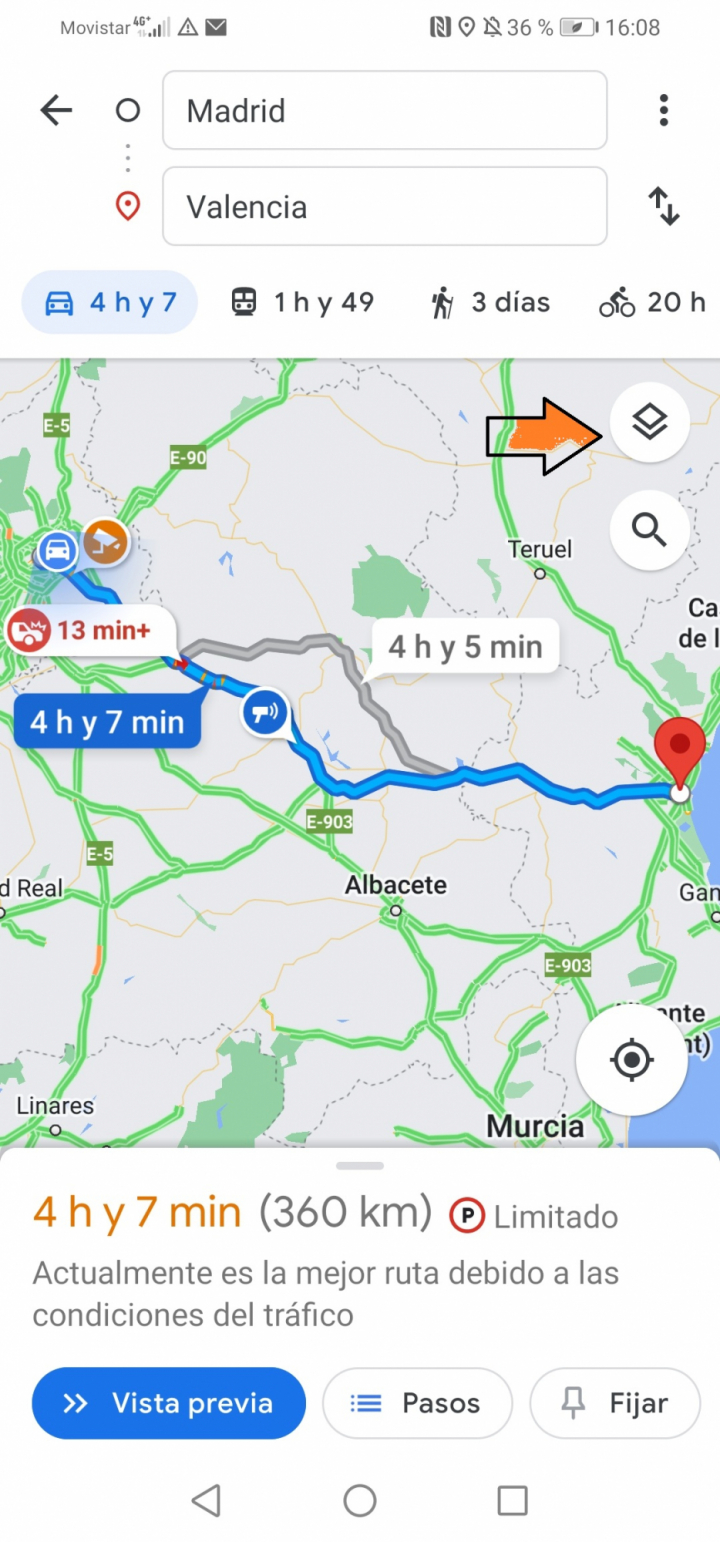 Justo en ese momento, antes de que pulses en el modo de 'Navegación', pulsa en el botón 'Capas' y activa la capa 'Tráfico'.
