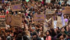 Las manifestantes portan pancartas en las que se pueden leer lemas como "Si nosotras paramos, el mundo se para" y "Un día no podremos más, y juntas lo podremos todo".