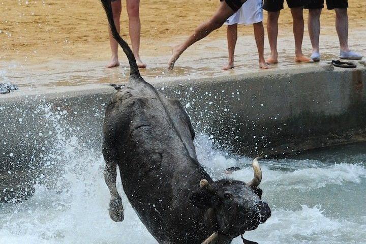 El espectáculo consiste en soltar toros en un recinto cerrado junto al mar, donde los participantes intentan provocar al animal para que los persiga hasta el borde de la plataforma, con el objetivo de que ambos —humano y toro— acaben en el agua. La peculiaridad de esta tradición reside en su carácter lúdico y en la ausencia de violencia hacia el animal, que es rescatado inmediatamente por barqueros especializados.