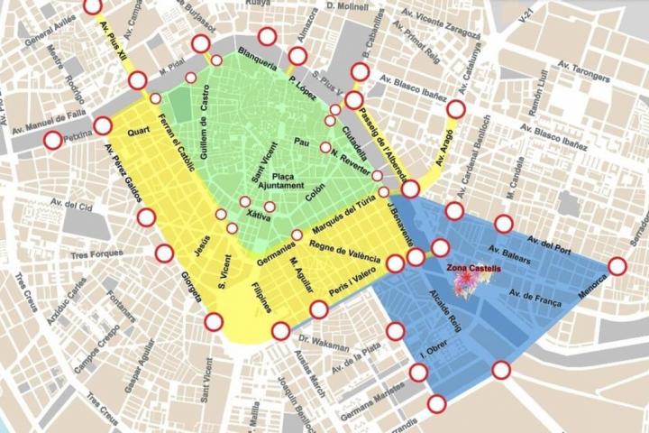 Desde el día 16 y hasta el 20 de marzo, quedará terminantemente prohibido circular por el perímetro que forma la vía marginal derecha del Turia, es decir, desde el puente de las Glorias Valencianas hasta la plaza América. Además, esto es extensible a las grandes vías, Plaza de España y los pasos inferiores de Pechina. Solo podrán pasar los taxis, el transporte público y otros vehículos previamente autorizados para ello.