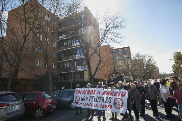 Centenares de personas se han manifestado este domingo en Ermita del Santo, Madrid, para protestar contra el "pelotazo especulativo" que prevé recalificar un terreno de uso comercial y deportivo para construir unas 600 viviendas, mayoritariamente de lujo, en torres de hasta 28 plantas, y un macroparking para 2.000 nuevos coches" en la zona.