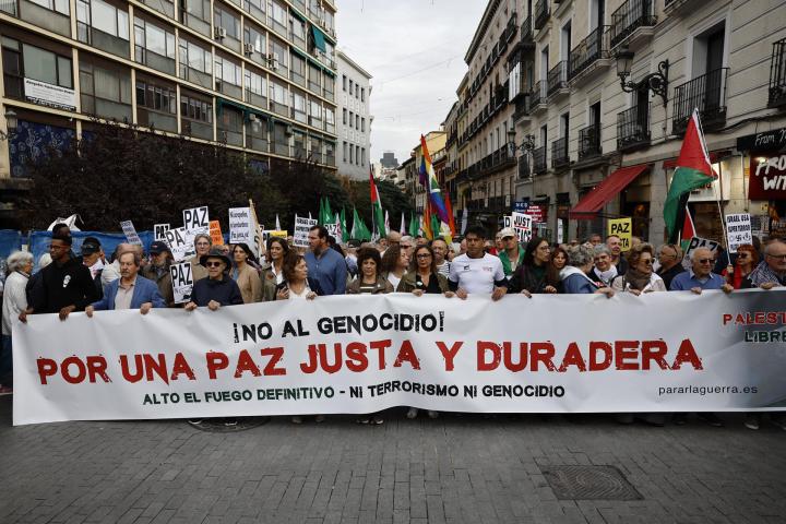 Cientos de personas han recorrido este domingo las calles del centro de Madrid para pedir una paz "justa y duradera" en Palestina, además de reclamar un alto el fuego "definitivo" y que se obligue a Israel a "cumplir con la legalidad internacional".