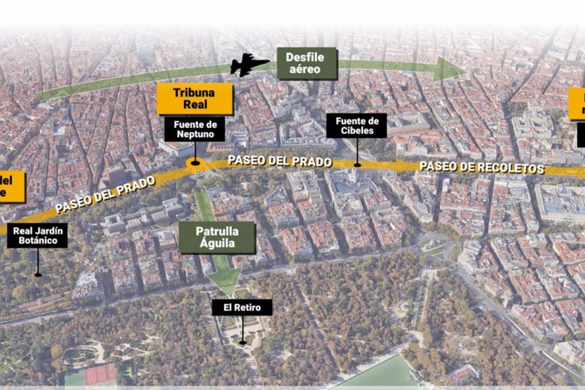 La parada militar con motivo del Día de la Fiesta Nacional, que tendrá lugar entre las 11:00 y las 14:00, se celebrará en los distritos de Chamberí, Salamanca, Centro y Retiro. El desfile terrestre partirá sobre las 12:00 de la glorieta del Emperador Carlos V y proseguirá por el Paseo del Prado, Plaza de Cibeles, Paseo de Recoletos y Plaza de Colón, con previsión de finalizar a las 13.30.