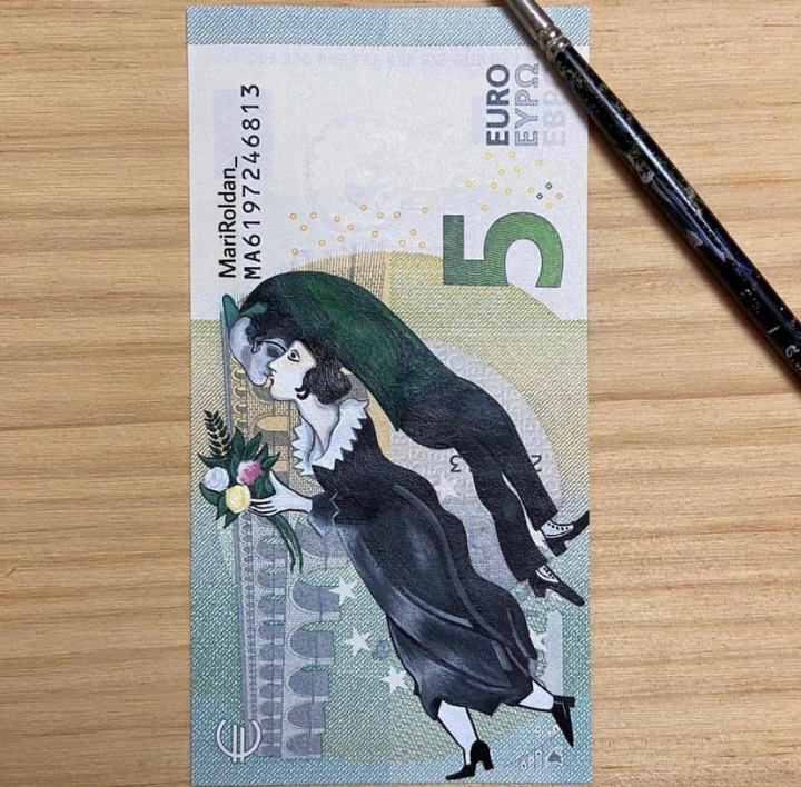 Con Lana del Rey o Ludovico sonando de fondo, un jarrón de flores en su mesa y varias velas ambientando su estudio, Roldán lleva desde 2017 poniendo a la circulación dinero convertido en obras de arte. Esta andaluza se dedica básicamente a pintar cuadros famosos o dibujos sobre monedas y billetes con los que luego compra algún producto para que circule y vaya cambiando de manos viajando así por el mundo.