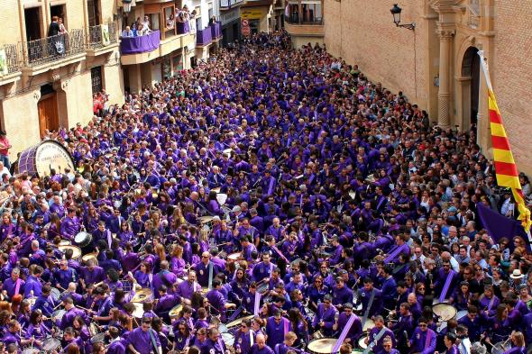 A las doce en punto del mediodía, el silencio en Calanda no es normal. Es un silencio denso, contenido, casi irreal. Te corta la respiración. La plaza -y ya no solo la plaza, sino calles, balcones y cualquier rincón cercano- está teñida de morado. Nadie toca todavía. Nadie habla. Nadie rompe ese instante suspendido.