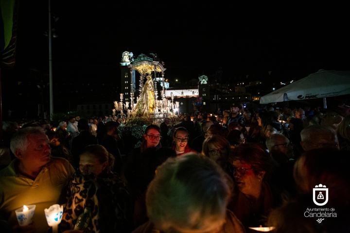 La noche de este miércoles ha tenido lugar la celebración de la eucaristía, la bendición y la procesión de Las Candela por la Plaza de la Patrona de Canarias y las calles Obispo Pérez Cáceres y Los Príncipes, y el Santo Rosario.
