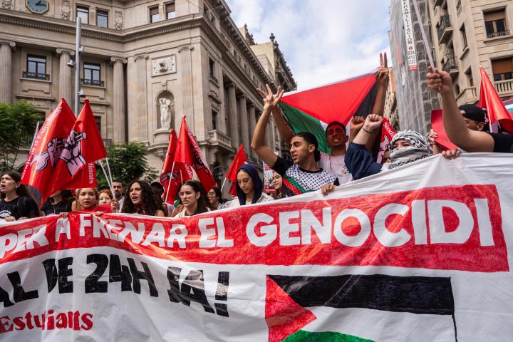 En Barcelona, una concentración que ha arrancado a las 12:00 horas en los Jardinets de Gràcia, ha congrega a miles de personas bajo el lema de denuncia del "genocidio israelí" y en rechazo al reciente asalto a la Global Sumud Flotilla. La Guardia Urbana cifra la participación en unas 70.000 personas, un número que los organizadores elevan a 300.000.