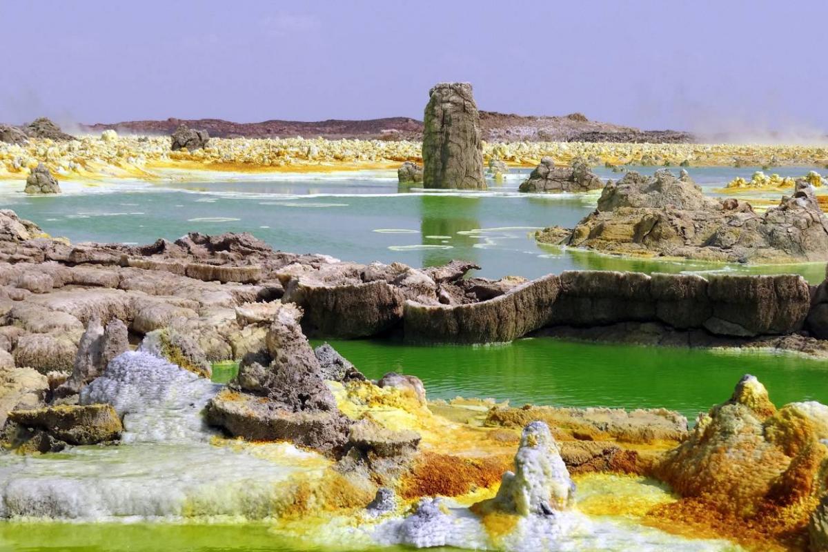 El campo geotermal de Dallol, ubicado en la depresión de Danakil en Etiopía, es un entorno extremo que desafía los límites de la habitabilidad. Este paisaje infernal, con temperaturas que superan los 45 °C incluso en invierno, alberga charcas hipersalinas e hiperácidas con valores de pH negativos. A pesar de la presencia de agua líquida, un reciente estudio liderado por la bióloga Purificación López García del CNRS de Francia ha demostrado que no hay vida microbiana en estas piscinas saladas, calientes e hiperácidas.