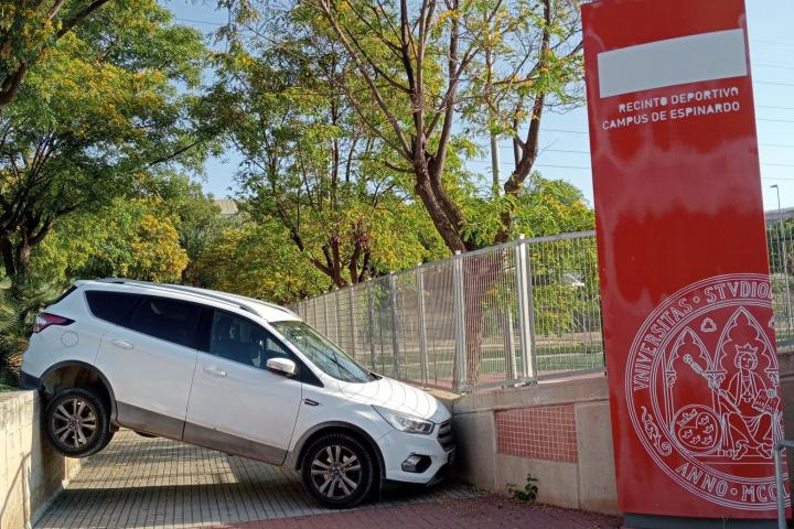 Un estudiante de biología que estaba por el Campus de Espinardo, perteneciente a la Universidad de Murcia, fue el primero que se encontró con una dantesca escena: un coche sin freno de mano que terminó como todo el mundo se puede imaginar. Y aprovechó para hacer una fotografía y subirla a sus redes sociales.