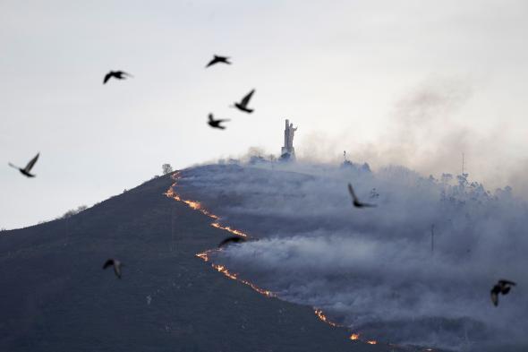 Lo que sí es totalmente visible entre las columnas de humo y las llamaradas es el monumento al Sagrado Corazón de Jesús presidiendo la ladera completamente calcinada y el avance del fuego por esta parte del monte.