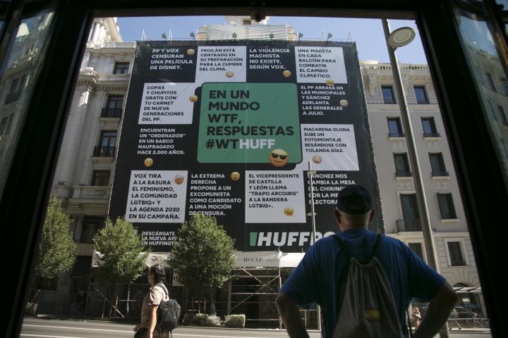 Dentro de esta iniciativa, el medio también ha desplegado este jueves una lona gigante en la madrileña calle de Gran Vía con el lema de su campaña, "En un mundo WTF, respuestas WTHUFF", o lo que es lo mismo, "En un mundo What The Fuck, respuestas What The Huff". En el cartel se pueden leer algunos titulares que en los últimos meses han protagonizado la actualidad política española. Por ejemplo, "Sánchez nos cambia la mesa del chiringuito por la mesa electoral" o "Macarena Olona sube un fotomontaje besándose con Yolanda Díaz". Son noticias tan sorprendentes que llevan a los lectores a preguntarse "What The Fuck?". Para entenderlo, el medio se presenta como el lugar donde encontrar las respuestas para entender qué ocurre en el mundo, hasta las noticias más inverosímiles.