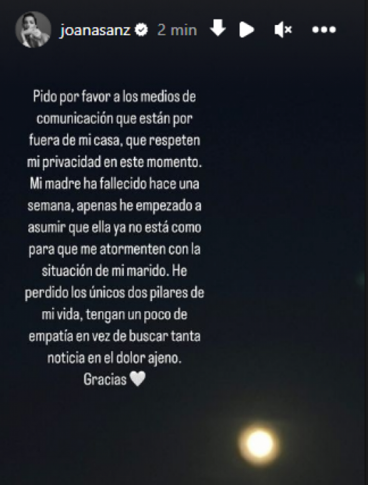 "Pido por favor a los medios de comunicación que están fuera de mi casa que respeten mi privacidad en este momento. Mi madre ha fallecido hace una semana, apenas he empezado a asumir que ella ya no está como para que me atormenten con la situación de mi marido", ha asegurado en una story en su cuenta de Instagram.