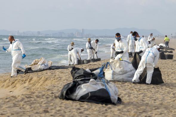 El vertido, de 2 kilómetros de longitud y dos metros de ancho, llegó a las playas, donde equipos de limpieza están recogiendo la arena contaminada de manera manual.