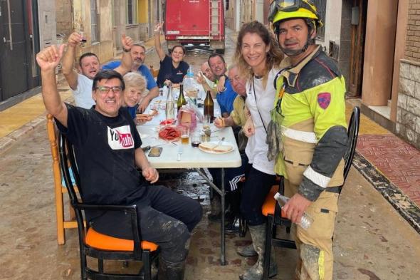 Nueve vecinos de la calle Galicia del municipio valenciano de Cantarroja, uno de los más afectados por el paso de la DANA que arrasó a la región el pasado martes, y un bombero. Todos alrededor de una mesa colocada delante del número 88 de la vía sobre la que se ven sándwich, tres botellas de agua, una de vino y otra de cerveza. Parece una estampa más propia de una fiesta de pueblo de verano, pero se ha convertido en la escena de la esperanza tras la tragedia.