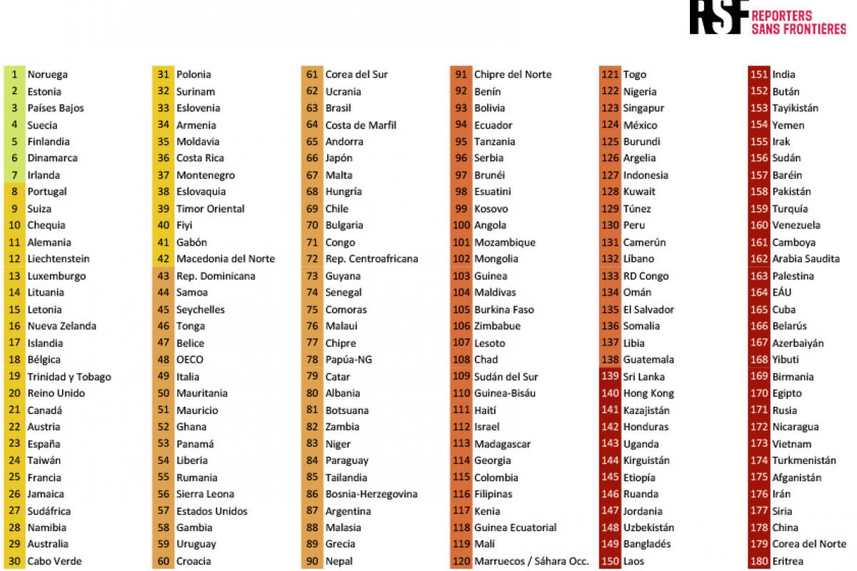 La última posición vuelve a ser para Eritrea (180) y justo por encima figuran Corea del Norte, China (cae seis puestos), Siria, Irán y Afganistán.