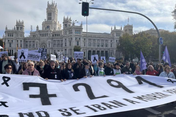 Una manifestación convocada por la Marea de Residencias ha recorrido este sábado la Gran Vía de Madrid para pedir "justicia y responsabilidades" por los 7.291 ancianos fallecidos durante la pandemia de la Covid-19 en la Comunidad.
