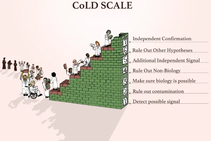 En la misma nota donde han compartido este hallazgo, la NASA ha recordado que los astro biólogos "tienen una escala de siete pasos, llamada escala CoLD, para investigar si una muestra podría indicar vida".