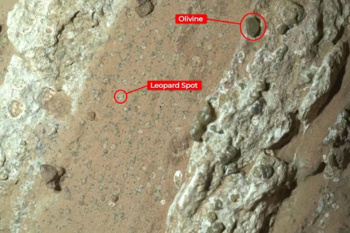 Además de sus manchas de leopardo, las cuales resultan de gran interés para la comunidad científica, la roca también contiene otros aspectos que llaman la atención, como los cristales de olivino de tamaño milimétrico que se encontraron en las vetas de la roca. "El olivino podría estar relacionado con rocas que se formaron más arriba en el borde del valle del rio y que pueden haberse producido por cristalización del magma", explica la nota de la NASA.