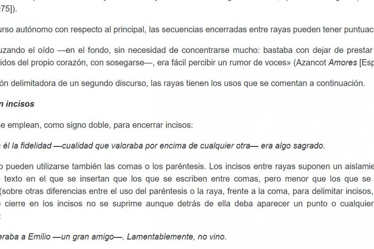 Además, la RAE especifica que en incisos incluidos dentro de otros incisos, se deben utilizar las rayas para la nueva aclaración, mientras que para intercalar datos en un inciso ya delimitado por rayas, se deben usar paréntesis. Esta jerarquía de signos ayuda a mantener la coherencia y la legibilidad del texto.
