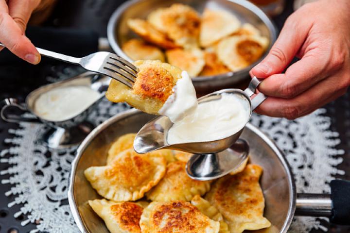 Por último, los pierogi suelen servirse con aderezos como aceite, manteca de cerdo con chicharrones, cebolla guisada con grasa, mantequilla derretida, yogur natural o nata montada.
