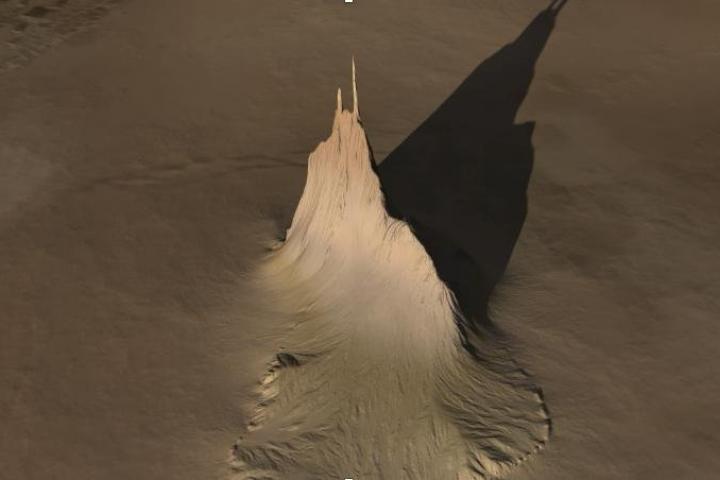 La NASA acaba de presentar una recreación de una de las montañas que han descubierto, hasta ahora la más increíble. La llaman Steeple Mountain. "Parece más un castillo de arena gigante que una montaña", dicen, por su forma. Según su recreación, un de sus laterales parece haberse derrumbado, lo que hace que termine en un pico muy puntiagudo.