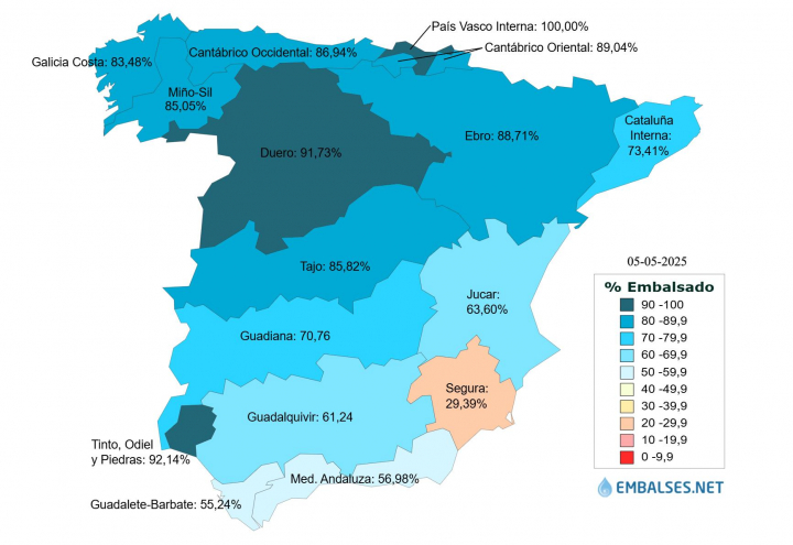 En el extremo opuesto, varias cuencas registran niveles muy elevados: las internas del País Vasco están al 100% de su capacidad; el Duero alcanza el 91,73%; el Ebro llega al 88,71%; el Cantábrico Oriental al 89,04%; el Cantábrico Occidental al 86,94%; el Tajo al 85,82%; el Miño-Sil al 85,05% y Galicia Costa al 83,48%. También destacan los sistemas de Tinto, Odiel y Piedras (92,14%) y el Guadiana (70,76%).