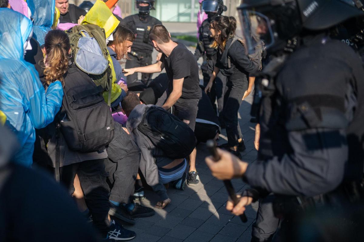 Tras estar un rato concentrados, los activistas han intentado acercarse a las puertas del pabellón utilizando máscaras y portando chubasqueros, señal de que tenían planeado lanzar pintura en polvo contra los congresistas como el año pasado.