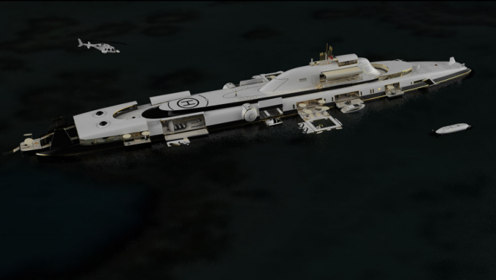 Como es habitual, la privacidad bajo agua es una de las premisas para todos ellos, aunque no es la única, ya que esta embarcación cuenta con suites VIP, gimnasios, jacuzzis, spa, etc. Su modelo M5 cuenta con 165 metros de largo, donde se ubica un helipuerto y una piscina. Esto no sería extraño si no fuera por el hecho de que es sumergible hasta 250 metros, pudiendo aguantar bajo el agua hasta cuatro semanas.