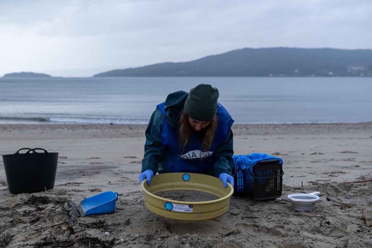 Guantes, coladores de cocina, escobas, cedazos... cualquier artilugio vale para los cientos de voluntarios que se han lanzado estos días a las costas gallegas para tratar de retirar las millones de pequeñas bolitas de plástico que han inundado las playas tras el vertido de varios contenedores de estos microplásticos conocidos como pellets provenientes del buque Toconao en aguas portuguesas.