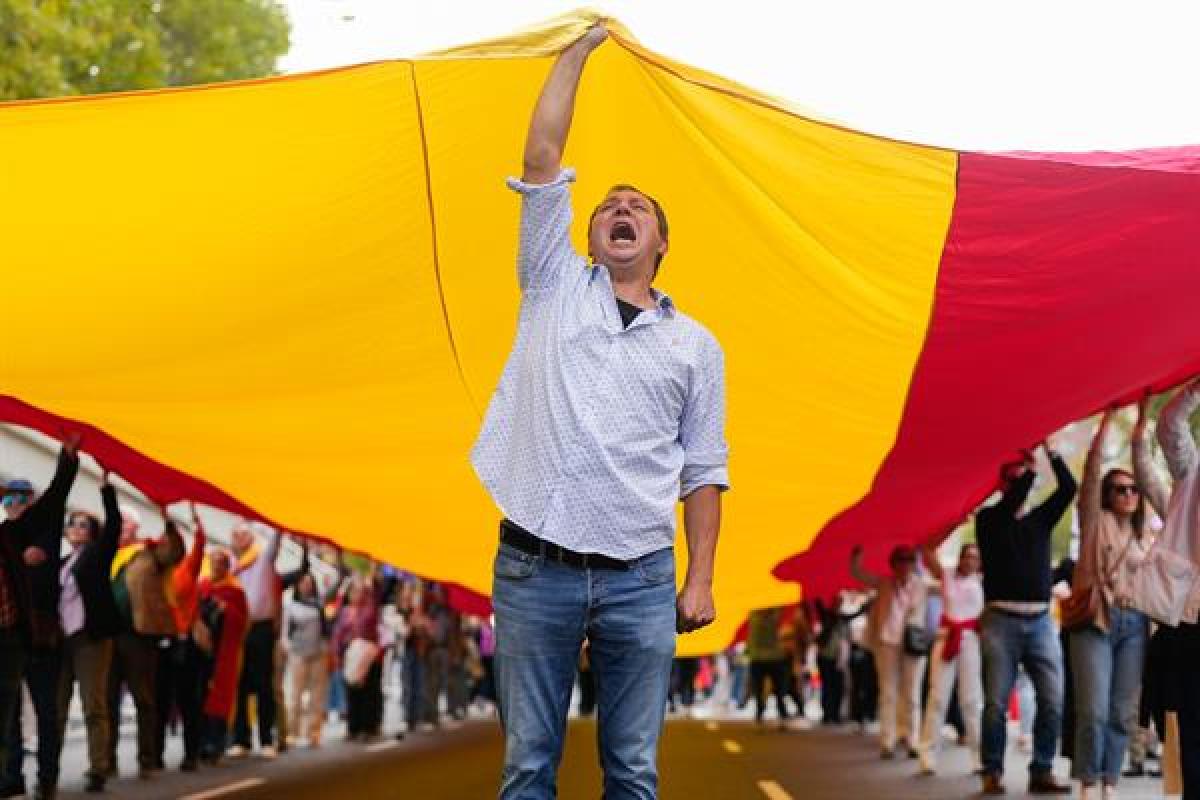 A grito de “Sánchez dimisión” o “No es un partido, es una mafia” y portando banderas de España, así como de la Unión Europea o la de la Cruz de Borgoña, miles de personas se han reunido bajo el lema ‘Por la unidad, la dignidad, la ley y la libertad. ¡Elecciones generales ya!’.