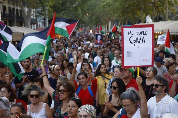 Unas 2.500 personas, según estimaciones de la policía, se han manifestado este sábado en el centro de Barcelona para denunciar el "genocidio" israelí contra la población palestina de Gaza, en una jornada en la que se habían convocado protestas también en otras ciudades del país, como Madrid o Sevilla.
