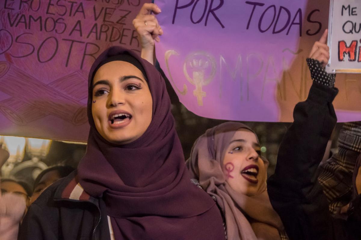 La imagen se ha repetido habitualmente en el pasado, pero sigue llamando la atención: mujeres musulmanas participando de forma activa en las diferentes marchas del 8-M, gritando lemas y portando pancartas que reivindican la igualdad de la mujer. Algunos suelen mirar la escena extrañados, otros observan en silencio mientras en sus cabezas se suceden siempre las mismas preguntas: ¿Por qué acuden estas mujeres año tras año a la manifestación feminista ataviadas con el hiyab? ¿No es una prenda represora y un instrumento de control patriarcal? ¿No es, de hecho, el Islam una religión machista que oprime a la mujer?