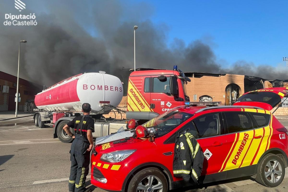 Nueve dotaciones de bomberos trabajan en la extinción de un incendio industrial que afecta a varias naves en Vinaròs (Castellón)