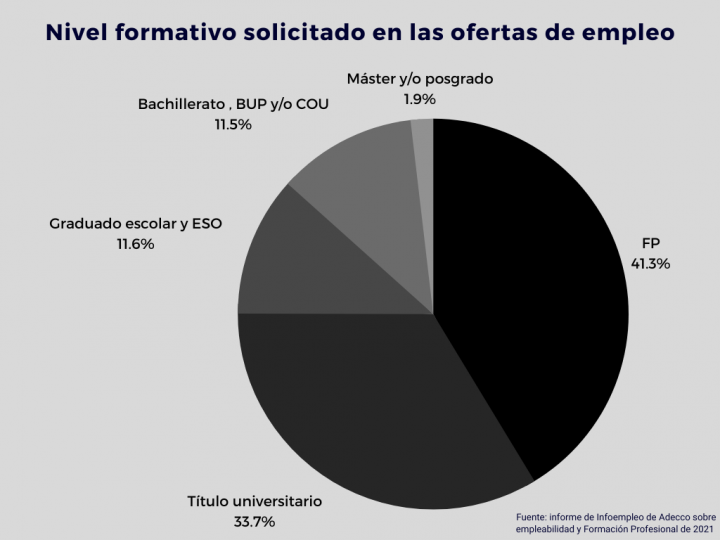 La empleabilidad es uno de los factores decisivos para los jóvenes a la hora de decidir qué estudiar. Según el informe de Infoempleo de Adecco sobre empleabilidad y Formación Profesional de 2021, facilitado a este medio por el Ministerio de Pilar Alegría, la FP es el nivel formativo más demandado por las empresas españolas. En total, el 41,3% de las ofertas de trabajo en España requieren candidatos titulados en Formación Profesional. Las que precisan de un título universitario se sitúan en el 33,7%.