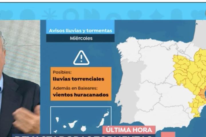 Por eso lanza ese aviso para que todo el mundo sepa que el tiempo "va a complicarse en el área mediterránea". Explica, además, que las zonas más críticas son "Cataluña, Comunidad Valenciana y sobre todo Baleares donde las tormentas podrían acumular 50 l/m2 o más en tan solo una hora acompañados de rachas muy fuertes de viento que incluso podrían superar los 120 km/h con lo que sería un viento huracanado". El panorama no se queda en eso, ya que augura que las lluvias pueden descargar con fuerza también "en el sur de Cataluña, este de Aragón y litorales de la Comunidad Valencia".