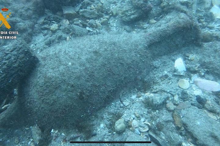 Según ha explicado la Comandancia local de la Benemérita en un comunicado, los guardias encontraron la pieza "semienterrada entre escombros y fango" y sin tapón, por lo que estaba "colonizada por diferentes organismos marinos" y llena de "conchas y piedras".