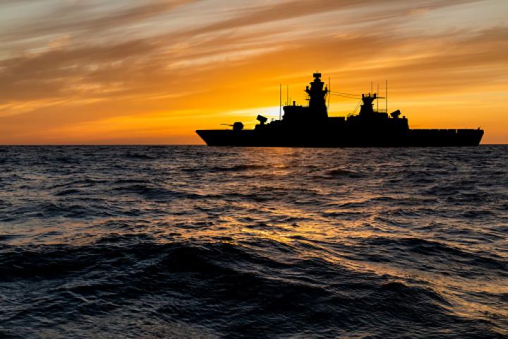 Warship at sunset in the sea.Getty Images