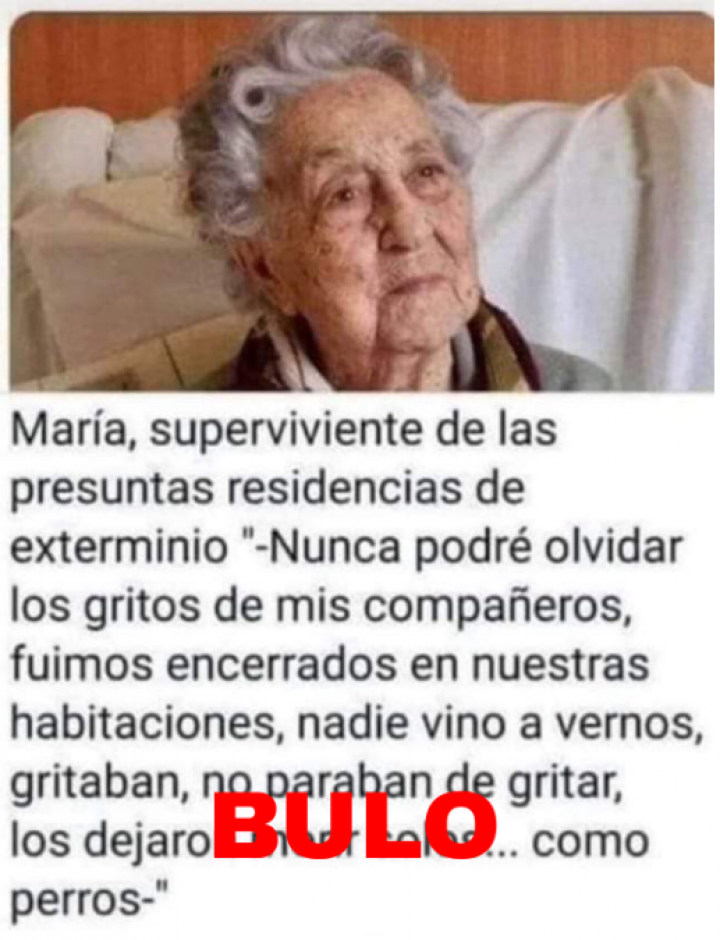 "María, superviviente de las presuntas residencias de exterminio: 'Nunca podré olvidar los gritos de mis compañeros, fuimos encerrados en nuestras habitaciones, nadie vino a vernos, gritaban, no paraban de gritar, los dejaron morir solos... como perros'". Estas son las declaraciones que supuestamente habría hecho María Branyas, una mujer de 116 años.