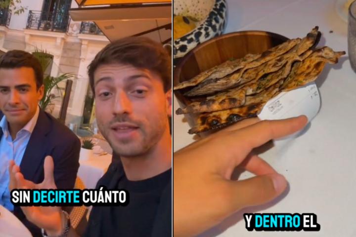 "Fijaos en esto", comienza el joven señalando un plato de la mesa, "que en un restaurante os pongan algo de entrada, sin decirte cuánto cuesta es ilegal", advierte. "Es lo que hacen en muchos restaurantes, pero aquí te ponen esta movida que no hemos pedido y dentro el precio. Sí señor, buenas prácticas", explica mientras muestra el ticket que incluye el precio.