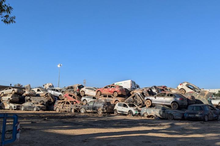 La entrada de Alfafar es un cementerio de coches. En un descampado varias torres de vehículos destrozados y envueltos en lodo esperan que sus dueños acudan a hacer “una foto para el seguro” un mes después. Puede que el propietario perdiese su coche a kilómetros de este pueblo. Nada está donde debería. En las calles más de lo mismo. La UME sigue vaciando garajes y colocando los coches donde se puede.