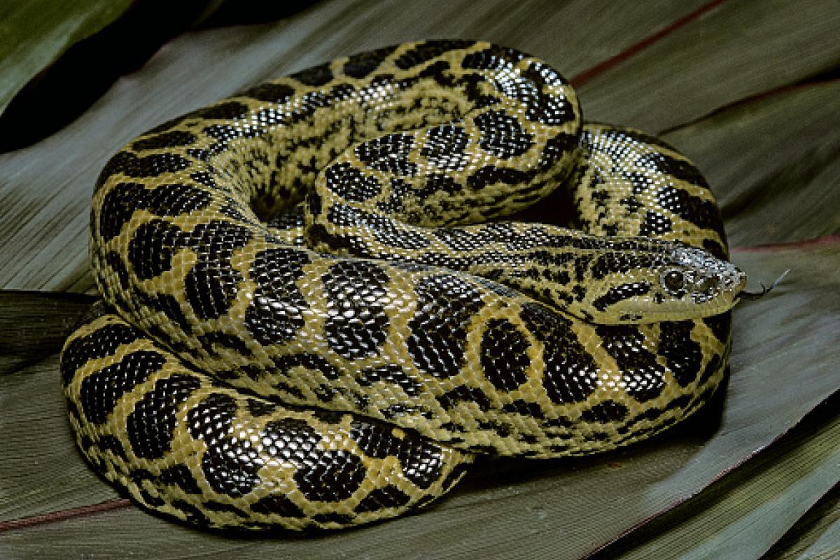 Originaria de Sudamérica, esta especie puede alcanzar los cuatro metros de longitud y pesar más de 40 kilos. Aunque no es venenosa, una mordedura de anaconda puede causar serias heridas.