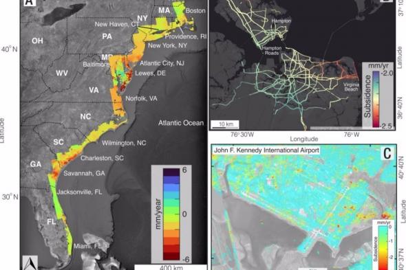 En varias ciudades a lo largo de la costa este, múltiples infraestructuras críticas, como carreteras, ferrocarriles, aeropuertos y diques, se ven afectadas por diferentes tasas de hundimiento.