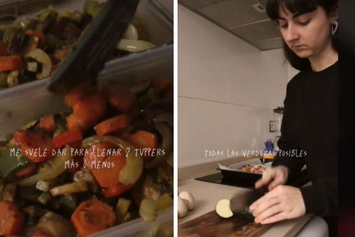 "Hoy os enseño mi truco para comer más verduras. Durante la semana las verduras es un alimento que como a diario, pero que me suele dar bastante pereza cada vez que me pongo a cocinar, tener que cortar, etcétera Así que lo que hago es encontrar un momento durante la semana en el que me apetezca estar tranquilita, ponerme un podcast y ponerme a cortar todas las verduras posibles e ir poniéndolas en una bandeja de horno", comienza en su relato la joven.