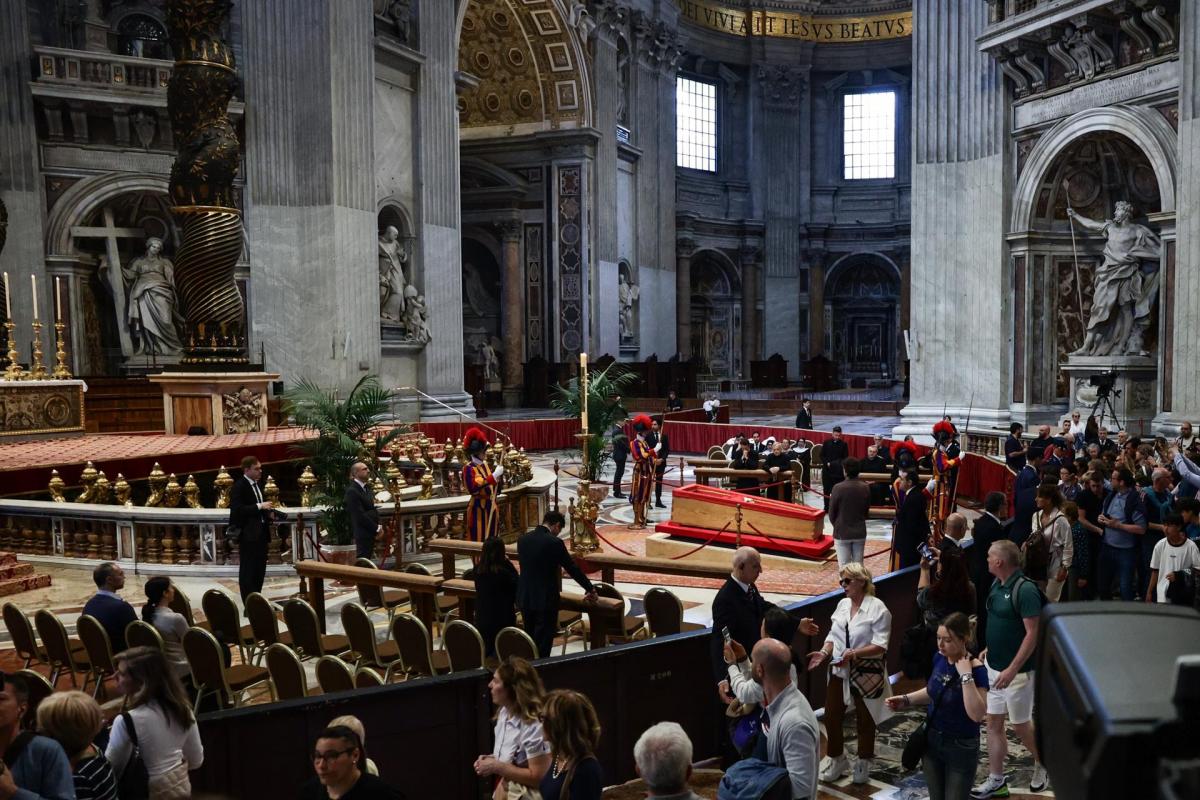 El ataúd abierto del papa, llevado en procesión a hombros por los 'sediarios' pontificios y escoltado por la Guardia Suiza, llegó a la basílica de San Pedro y fue colocado el Altar de la Confesión, donde los fieles disponen de unos instantes para ver por última vez a Francisco.