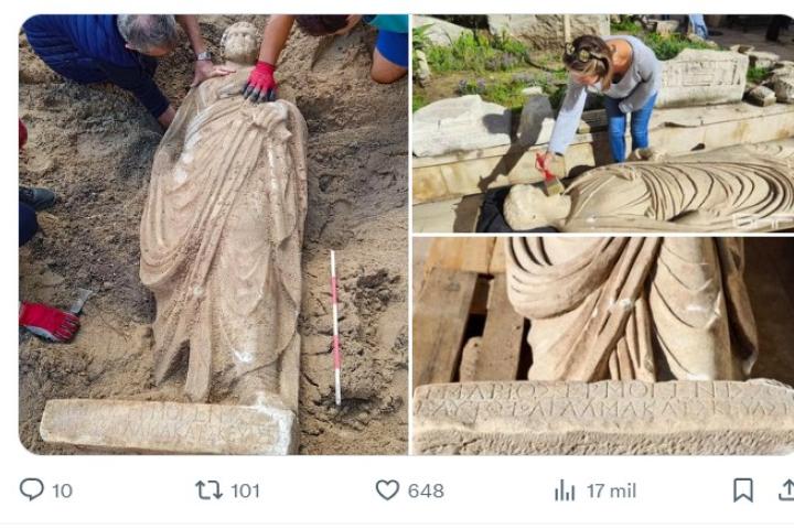 Una portentosa estatua romana emerge de una obra y una inscripción provoca la intervención inmediata de los arqueólogos