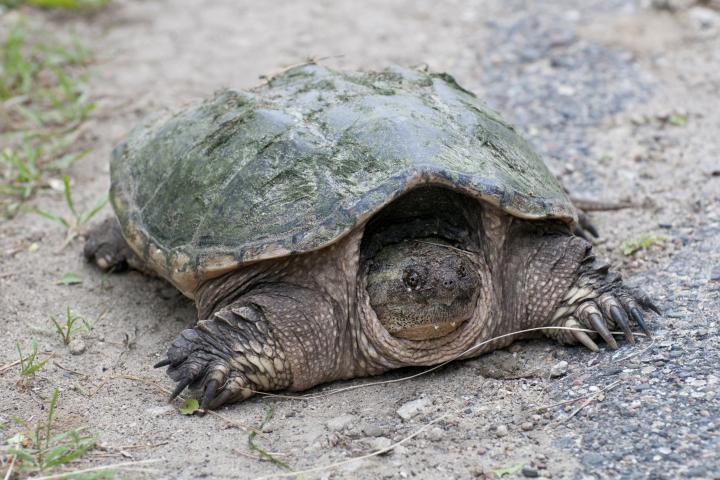 La tortuga serpentina, también conocida por otros nombres como tortuga lagarto, tortuga satán, tortuga mordedora o tortuga toro, es una especie que destaca por su aspecto robusto y su comportamiento agresivo. Su cola, casi tan larga como el caparazón, presenta una hilera de escamas en forma de sierra.