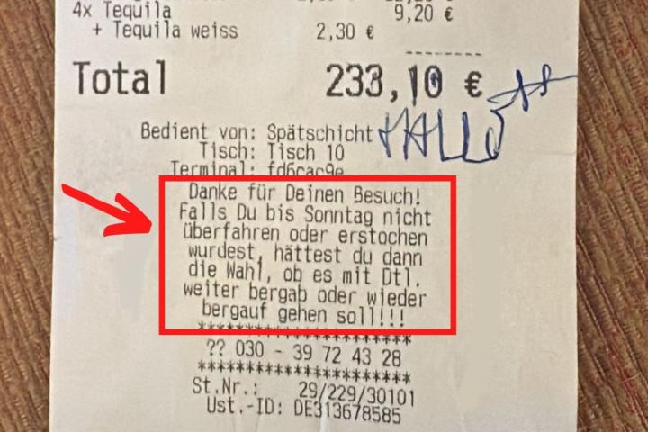 Tras una noche de copas, el equipo de trabajo encontró un mensaje político impreso en la cuenta del establecimiento: "Si no ha sido atropellado o apuñalado el domingo, entonces tendría la opción de elegir si Alemania debe continuar cuesta abajo o volver a subir".