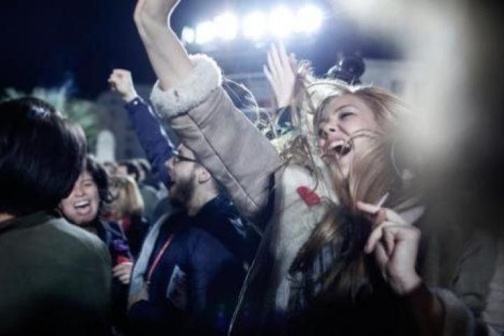 En cuanto se anuncian los resultados finales de las elecciones, Alexis Tsipras se dirige hacia los propileos para dar su discurso triunfal. Con las manos ligeramente temblorosas, abre la carpeta azul que tiene enfrente y saca el discurso que ha preparado para la ocasión. Su discurso es alentador y meticulosamente cuidado, pues sabe que cada palabra que diga se examinará con microscopio. Concluye y se va. Abajo, la multitud disfruta y baila. De repente, Tsipras se gira y grita: "La gente tiene derecho a celebrar y bailar, en estos cinco años nos habían privado de ello".
