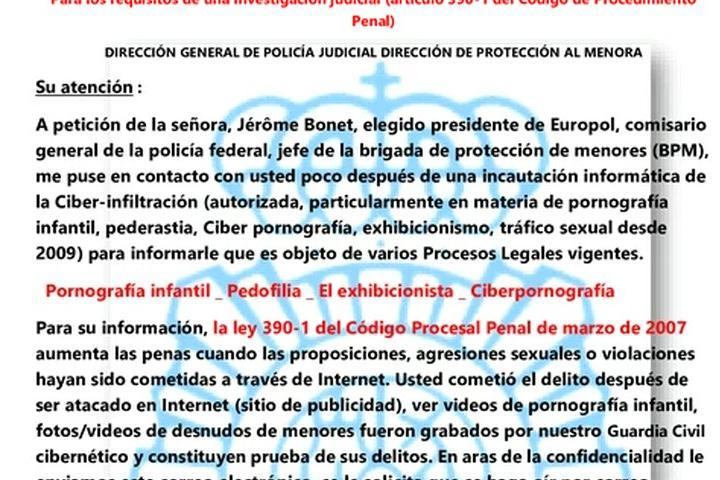 En todos se suplanta la identidad de la directora general de la Guardia Civil, y se informa a la víctima, de manera alarmante, de una supuesta investigación por haber estado consumiendo contenido ilegal asociado a la pornografía infantil, pedofilia, exhibicionismo, ciberpornografía o tráfico sexual. Además, mencionan un artículo a nivel legal para justificar su fraude.