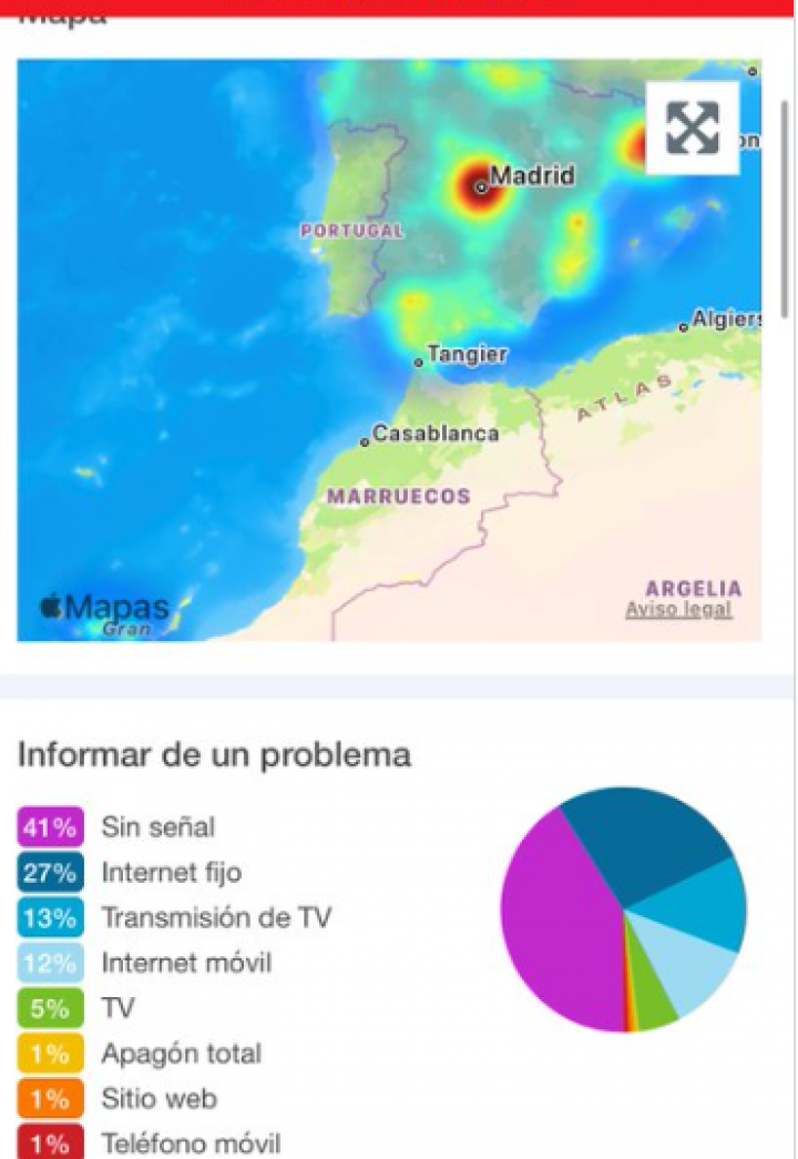 Según ha informado un usuario de la red social, @JoanMartin_, la caída también ha afectado a los servicios de telefonía, siendo el epicentro la capital madrileña.